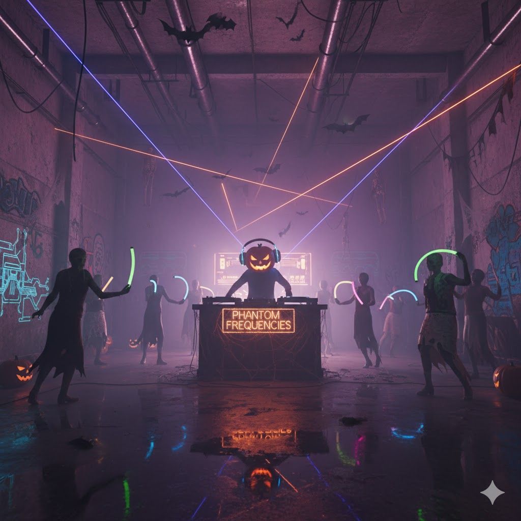 A glowing jack-o'-lantern wearing oversized headphones, DJing at a spooky underground rave in an abandoned warehouse, surrounded by dancing ghosts with glow sticks, neon purple and orange lighting, fog machines, vintage turntables covered in cobwebs, bats flying through laser beams, cyberpunk meets classic Halloween aesthetic, ultra detailed, cinematic lighting, 4KA little sneak peek…