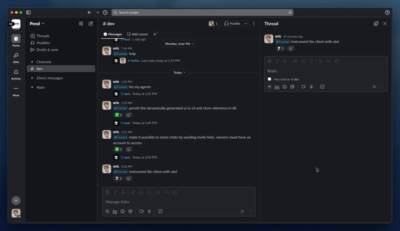 Customize with commands: Use advanced options like @Cursor [branch=main] [model=o3] [prompt] to specify which branch, AI model, and repository to work with. The agent reads entire thread context, so your team's discussion becomes part of the coding instructions.
